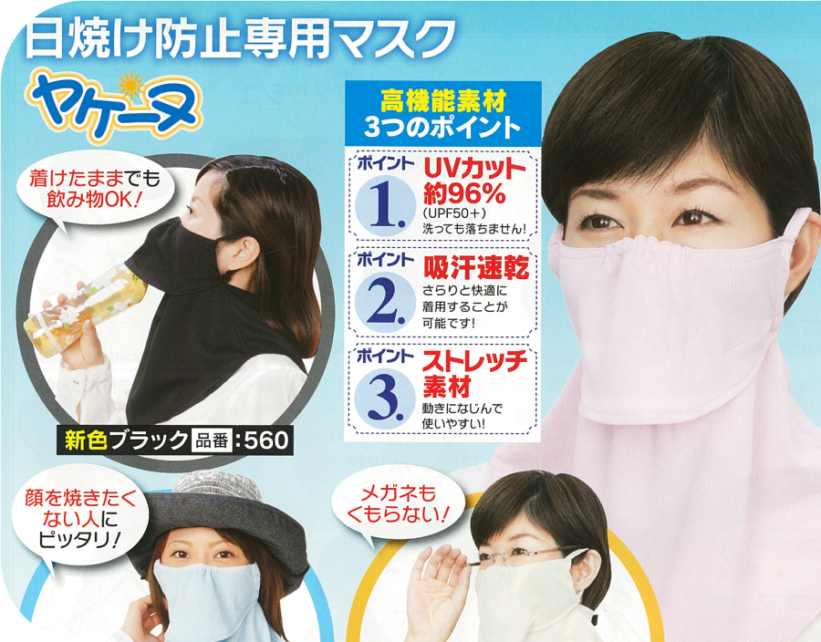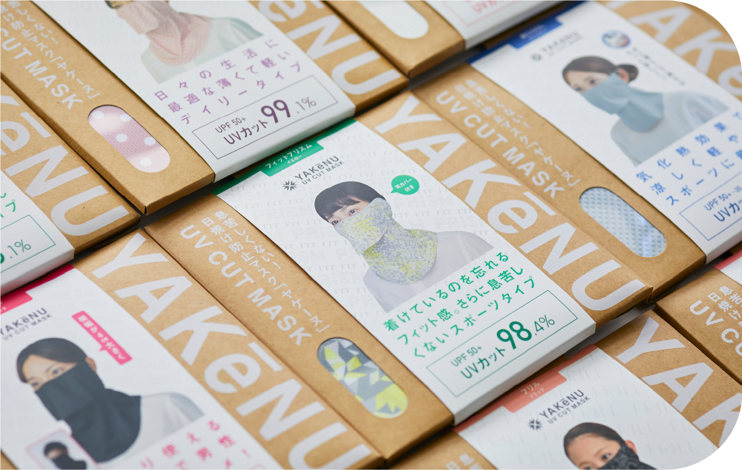「涼かちゃん」のヒットを皮切りに、丸福繊維はオリジナル商品の開発を本格始動。「農業の困りごとを解決する」を目標に掲げ、直接農家さんの声を聞くために度々田畑へと足を運びました。その際に最も多く耳にしたのは「とにかく日焼けしたくない…」と悩む女性の声です。そして、生まれた商品が紫外線対策用のフェイスカバー「ヤケーヌ」。何度も試作とモニターテストを重ねて完成させた「ヤケーヌ」は、従来のタオルや手ぬぐいでの日焼け対策より圧倒的に快適!と高い評価を得ることができました。その後「ヤケーヌ」は農協での販路を中心に大ヒット。丸福繊維を代表するオリジナル商品へ成長しました。